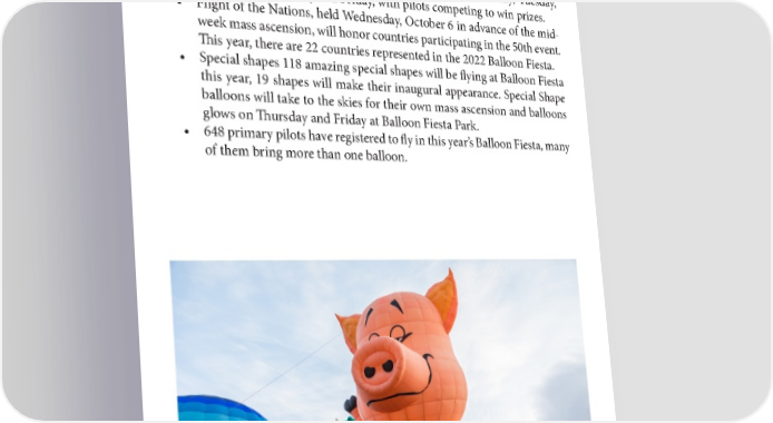 39 Albuquerque International Balloon Fiesta 2022 Media Guide 2022 NEWS RELEASE SUMMARIES ALBUQUERQUE INTERNATIONAL BALLOON FIESTA® CELEBRATES 50TH EVENT World’s Largest Ballooning Event Takes to Skies October 1-9 The Albuquerque International Balloon Fiesta celebrates its 50th event with 600 hot air balloons representing 22 countries. The 50th event will occur October 1-9, 2022 at Balloon Fiesta Park, in Albuquerque, NM. Key dates, events and facts: • Opening day at Balloon Fiesta Park will kick off with the Opening Ceremonies, beginning at 6:45 a.m. on October 1, 2022. • Hot air ballooning competitive flying takes place on Monday, Tuesday, Wednesday, Thursday and Friday, with pilots competing to win prizes. • Flight of the Nations, held Wednesday, October 6 in advance of the mid- week mass ascension, will honor countries participating in the 50th event. This year, there are 22 countries represented in the 2022 Balloon Fiesta. • Special shapes 118 amazing special shapes will be flying at Balloon Fiesta this year, 19 shapes will make their inaugural appearance. Special Shape balloons will take to the skies for their own mass ascension and balloons glows on Thursday and Friday at Balloon Fiesta Park. • 648 primary pilots have registered to fly in this year’s Balloon Fiesta, many of them bring more than one balloon.