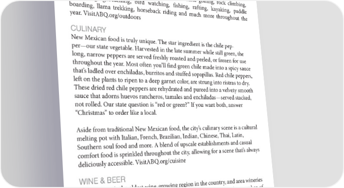 48 Albuquerque International Balloon Fiesta 2022 Media Guide WHILE YOU’RE IN ALBUQUERQUE PERFORMING ARTS Albuquerque is home to a thriving performing arts scene, with several venues offering tickets ranging from $10-$15. Albuquerque’s flourishing arts community offers the chance to catch amazing live theater, dance, music, poetry and other performing arts at one of Albuquerque’s many venues. OUTDOOR RECREATION With 310+ days of sunshine per year and an average altitude around 5,500 feet, Albuquerque and its neighboring two-mile-high Sandia Mountains provide excellent terrain for hiking and biking in the summer, and skiing or snowboarding in the winter. The city’s location in a high desert rift valley also lends itself to hot air ballooning, cycling, affordable golfing, rock climbing, bouldering, geocaching, bird watching, fishing, rafting, kayaking, paddle boarding, llama trekking, horseback riding and much more throughout the year. VisitABQ.org/outdoors CULINARY New Mexican food is truly unique. The star ingredient is the chile pep - per—our state vegetable. Harvested in the late summer while still green, the long, narrow peppers are served freshly roasted and peeled, or frozen for use throughout the year. Most often you’ll find green chile made into a spicy sauce that’s ladled over enchiladas, burritos and stuffed sopapillas. Red chile peppers, left on the plants to ripen to a deep garnet color, are strung into ristras to dry. These dried red chile peppers are rehydrated and pureed into a velvety smooth sauce that adorns huevos rancheros, tamales and enchiladas—served stacked, not rolled. Our state question is “red or green?” If you want both, answer “Christmas” to order like a local. Aside from traditional New Mexican food, the city’s culinary scene is a cultural melting pot with Italian, French, Brazilian, Indian, Chinese, Thai, Latin, Southern soul food and more. A blend of upscale establishments and casual comfort food is sprinkled throughout the city, allowing for a scene that’s always deliciously accessible. VisitABQ.org/cuisine WINE & BEER New Mexico is the oldest wine-growing region in the country, and area wineries offer tastings and tours. The city is also home to an ever-growing number of local microbreweries and taprooms, and the nation’s first officially designated Brewery District. VisitABQ.org/wine-beer MAJOR ATTRACTIONS ABQ BioPark The ABQ BioPark is an award-winning environmental museum comprising four facilities: Aquarium, Botanic Garden, Zoo and Tingley Beach. The Aquarium houses a new River Otter exhibit; a new Butterflies and Bees exhibit recently opened at the Botanic Garden; and the Zoo is now home to the new Penguin Chill exhibit. http://www.cabq.gov/biopark; (505) 768-2000 [CONTINUED]