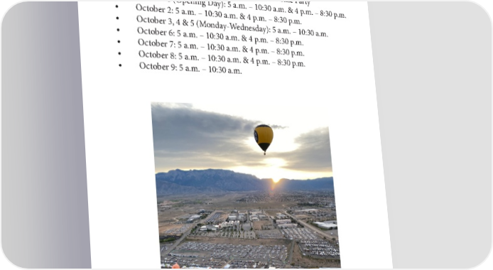 24 Albuquerque International Balloon Fiesta 2022 Media Guide MEDIA ACCESS MEDIA TENT Location – Hours of Operation – Activities The AIBF Media Tent is located on the southeast corner of Balloon Fiesta Park, very close to the launch field. There will be no storage provided for tripods, backpacks, and equipment. The media tent schedule is as follows: • September 29: 9 a.m. – 5 p.m. – Media Registration/Credential Pick up • September 30: 10 a.m. – 5 p.m. – Media Registration/Credential Pick up (NOTE: • this is one hour later than normal due to 50th event commemoration taking place at Coronado Mall on Friday morning. • September 30: 5 p.m. – 7 p.m. – Media Welcome Party • October 1 (Opening Day): 5 a.m. – 10:30 a.m. & 4 p.m. – 8:30 p.m. • October 2: 5 a.m. – 10:30 a.m. & 4 p.m. – 8:30 p.m. • October 3, 4 & 5 (Monday-Wednesday): 5 a.m. – 10:30 a.m. • October 6: 5 a.m. – 10:30 a.m. & 4 p.m. – 8:30 p.m. • October 7: 5 a.m. – 10:30 a.m. & 4 p.m. – 8:30 p.m. • October 8: 5 a.m. – 10:30 a.m. & 4 p.m. – 8:30 p.m. • October 9: 5 a.m. – 10:30 a.m.