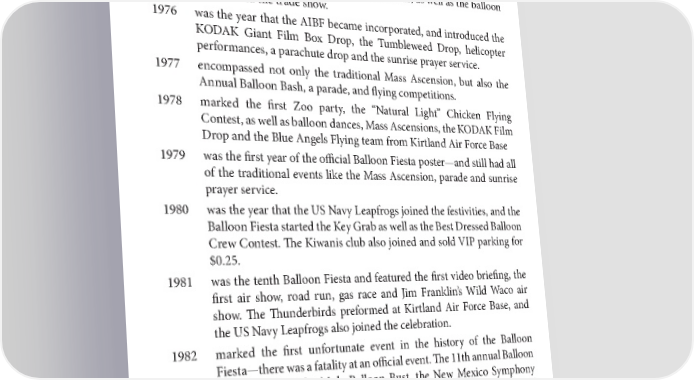 28 Albuquerque International Balloon Fiesta 2022 Media Guide BALLOON FIESTA HISTORY 50 YEARS OF BALLOON FIESTA HISTORY 1972 was the first year of the Albuquerque International Balloon Fiesta. Events included the 1st Roadrunner-Coyote Balloon Race and tours of the surrounding towns and pueblos. 1973 hosted the First World Championships, crowning of the Balloon Fiesta Queen, the first mass ascension and Balloon Fiesta parade. 1974 was the third annual Balloon Fiesta and a new Balloon Fiesta Queen was crowned. 1975 marked the introduction of the AAAA Cloudbouncer Balloon Rally, and the Balloon Fiesta was permanently moved to October. It also saw the introduction of the Air Force Thunderbirds, as well as the balloon seminar and the trade show. 1976 was the year that the AIBF became incorporated, and introduced the KODAK Giant Film Box Drop, the Tumbleweed Drop, helicopter performances, a parachute drop and the sunrise prayer service. 1977 encompassed not only the traditional Mass Ascension, but also the Annual Balloon Bash, a parade, and flying competitions. 1978 marked the first Zoo party, the “Natural Light” Chicken Flying Contest, as well as balloon dances, Mass Ascensions, the KODAK Film Drop and the Blue Angels Flying team from Kirtland Air Force Base 1979 was the first year of the official Balloon Fiesta poster—and still had all of the traditional events like the Mass Ascension, parade and sunrise prayer service. 1980 was the year that the US Navy Leapfrogs joined the festivities, and the Balloon Fiesta started the Key Grab as well as the Best Dressed Balloon Crew Contest. The Kiwanis club also joined and sold VIP parking for $0.25. 1981 was the tenth Balloon Fiesta and featured the first video briefing, the first air show, road run, gas race and Jim Franklin’s Wild Waco air show. The Thunderbirds preformed at Kirtland Air Force Base, and the US Navy Leapfrogs also joined the celebration. 1982 marked the first unfortunate event in the history of the Balloon Fiesta—there was a fatality at an official event. The 11th annual Balloon Fiesta included the Mule Balloon Bust, the New Mexico Symphony Orchestra, the Morgan Horse and Carriage Show, and a costume ball as well as a new kite flying contest. 1983 incorporated a 10k run, radio controlled aircraft and performances from high school bands around the state. 1984 included a kite flying demo, the first Park and Rides, the US Army “Golden Knights” Parachute Team and a picnic in addition to all of the traditional events. 1985 kept up with the times and included a bike and trikes/BMX race team demo, a Frisbee demo, the Albuquerque Vaulters, the Masters of the Universe, the Bob Sears Air Show, NASA Aerovan and a toga party. [CONTINUED]
