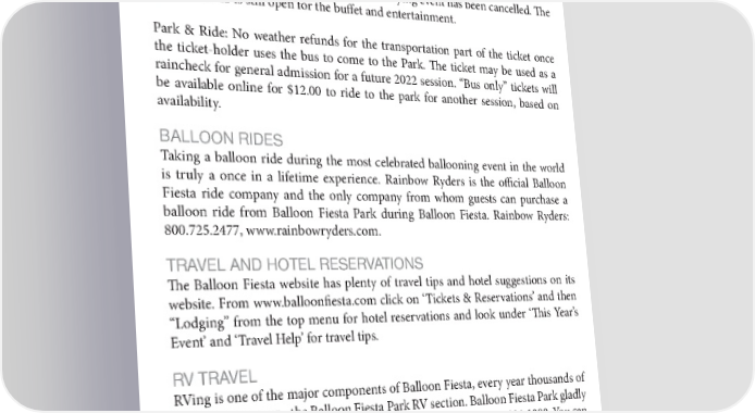 12 Albuquerque International Balloon Fiesta 2016 Media Guide 2022 Media Guide RAINCHECK POLICIES The Balloon Fiesta offers no refunds for unused tickets. However, rain checks will be issued if an individual balloon session must be canceled due to weather or other safety considerations, and the tickets can be used for any other balloon session at the 50th Balloon Fiesta. General Admission Tickets: Retain the ticket for re-admission in the event the session is canceled. Electronic tickets will be automatically reactivated by the ticketing company for raincheck events. Gondola Club Tickets: Once your order has been processed there are no refunds. Your ticket may be used as a raincheck for general admission to an alternative session. The Gondola Club does not close if a flying event has been cancelled. The Gondola Club is still open for the buffet and entertainment. Park & Ride: No weather refunds for the transportation part of the ticket once the ticket-holder uses the bus to come to the Park. The ticket may be used as a raincheck for general admission for a future 2022 session. “Bus only” tickets will be available online for $12.00 to ride to the park for another session, based on availability. BALLOON RIDES Taking a balloon ride during the most celebrated ballooning event in the world is truly a once in a lifetime experience. Rainbow Ryders is the official Balloon Fiesta ride company and the only company from whom guests can purchase a balloon ride from Balloon Fiesta Park during Balloon Fiesta. Rainbow Ryders: 800.725.2477, www.rainbowryders.com. TRAVEL AND HOTEL RESERVATIONS The Balloon Fiesta website has plenty of travel tips and hotel suggestions on its website. From www.balloonfiesta.com click on ‘Tickets & Reservations’ and then “Lodging” from the top menu for hotel reservations and look under ‘This Year’s Event’ and ‘Travel Help’ for travel tips. RV TRAVEL RVing is one of the major components of Balloon Fiesta, every year thousands of joyful RVers occupy the Balloon Fiesta Park RV section. Balloon Fiesta Park gladly welcomes RVers, for more information call 888.422.7277 or 505.821.1000. You can also visit www.balloonfiesta.com/RV-Information for more information. VISITOR INFORMATION Between Balloon Fiesta sessions there is a lot to see and do in Albuquerque. For more information, reach out to Visit Albuquerque and the New Mexico Department of Tourism. Visit Albuquerque 800.284.2282 www.visitalbuquerque.org Facebook: @VisitABQ Twitter: @VisitABQ Instagram:@visitabq New Mexico Tourism Department 505-827-7400 www.newmexico.org Facebook: @NewMexico Twitter: @NewMexico Instagram:@newmexicotrue GETTING TO THE PARK