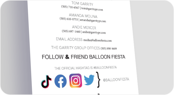 2022 BALLOON FIESTA MEDIA RELATIONS TEAM TOM GARRITY (505) 710-6567 | [email protected] AMANDA MOLINA (505) 610-0753 | amanda @garritypr.com ANDIE MERCER (505) 697-1460 | andie @garritypr.com EMAIL ADDRESS [email protected] THE GARRITY GROUP OFFICES (505) 898-8689 We congratulate Balloon Fiesta on 49 successful events. Our team is proud to lead the 50th Albuquerque International Balloon Fiesta media relations team. FOLLOW & FRIEND BALLOON FIESTA THE OFFICIAL HASHTAG IS #BALLOONFIESTA @BALLOONFIESTA } /BALLOONFIESTA } EMAIL ADDRESS [email protected]