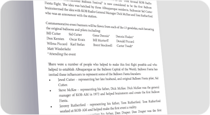 43 Albuquerque International Balloon Fiesta 2016 Media Guide 2022 Media Guide 2022 NEWS RELEASE SUMMARIES BALLOON FIESTA TO KICK OFF 50TH EVENT WITH REENACTMENT FLIGHT Event to honor original 13 pilots and balloons Albuquerque, NM – The Albuquerque International Balloon Fiesta (Balloon Fiesta) first took shape with an inaugural launch of 13 balloons, 50 years ago! On Friday, September 30, Balloon Fiesta will host a reenactment of the first flight that launched from Coronado Center, located at 6600 Menaul Blvd NE, Albuquerque, NM 87110. The reenactment will kick off festivities for the 50th event and commemorate the 13 original balloons and people who helped make that April 8, 1972 launch possible. It all started as a 50th anniversary celebration of KOB Radio (now known as Newsradio KKOB. The 1972 event, held at Coronado Center and labeled as the “First Annual KOB Radio & Television International Balloon Festival” is now considered to be the first Balloon Fiesta flight. The idea was hatched by three Albuquerque residents. Balloonist Sid Cutter brainstormed the idea with KOB Radio General Manager Dick McKee and Tom Rutherford who was an announcer with the station. Commemorative event banners will be flown from each of the 13 gondolas, each honoring the original balloons and pilots including: Bill Cutter Sid Cutter Gene Dennis* Dennis Floden* Don Kersten Oscar Kratz Bill Murtorff Donald Piccard Wilma Piccard Karl Stefan Brent Stockwell Carter Twedt* Matt Wiederkehr *Attending the event There were a number of people who helped to make this first flight possible and who helped to establish Albuquerque as the Balloon Capital of the World. Balloon Fiesta has invited these influencers to represent some of the Balloon Fiesta founders: • Jewel Cutter – representing her late husband, and original Balloon Fiesta pilot, Sid Cutter. • Steve McKee – representing his father, Dick McKee. Dick McKee was the general manager of KOB-AM in 1972 and helped brainstorm and create the first Balloon Fiesta. • Jeremy Rutherford - representing his father, Tom Rutherford. Tom Rutherford worked at KOB-AM and helped make the first event a reality. • Mike Draper – representing his father, Don Draper. Don Draper was the first Balloon Fiesta Balloonmeister and flew with Sid Cutter at the first event. • Greg Yost – representing his father, Ed Yost. Ed Yost is an iconic balloon pilot and architect. • Denise Wiederkehr McDonald – representing her father, Matt Wiederkehr. She took flight in the balloon piloted by Matt Wiederkehr. The event coincides with Albuquerque Aloft, Balloon Fiesta’s community launch from local elementary schools on September 30th around 7:00 a.m.
