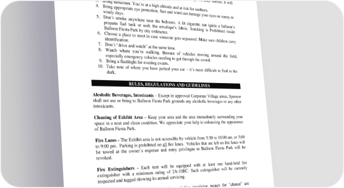 Albuquerque Interna tional Balloon Fies ta ® S ponsor Handboo k - 9 SAFETY TIPS 1. Limit alcohol consumption. You’re at a mile - high altitude, which increases alcohol ’ s effect. 2. D r ess in layer s . It’s sometimes very cool in the morni ng, but after sunrise, it will warm up. 3. Bring sunscreen. You’r e at a high altitude and at risk for sunburn. 4. Bring appropriate eye protection. Sun and wind can damage your eyes on sunny or win d y days. 5. Don ’ t smoke anyw h er e near the balloons. A lit cigar ette can ignite a balloon’s propane fuel tank or melt the envelope’ s fabric. Smoking is Prohibi ted inside Balloon Fiest a Park by city ordinance . 6. Choose a place to meet in case someone gets separat e d. Make sur e children car ry identification. 7. Don’t “drive and wat ch” at the same time. 8. Watch where you’re walking. Beware of v e hicles moving around the field, especially emergency vehicles needing to get through the crowd. 9. Bring a flashlight for evening events. 10. Tak e note of wh er e you have parked your car – it’s mor e difficult to find in the dark . RULES, REGULATIONS AND GUIDE LINE S Alcoholic Beverages, Intoxicants – Except in approved Corporate Village areas, Sponsor shall not use or bring to Balloon F i esta Park gr o unds any al co holic beverages or any other intoxica nts. Cleaning of Exhibit Area – Keep your area and the area i mmed iately surrounding your space in a neat and clean condition. We appreciate your help in enhancing the appearance of Balloon Fi e sta Park. F i re Lanes - Th e Exhibit area is not accessible by v ehicle from 5:30 to 10:00 am, o r 5:00 to 9:00 pm. Parking is proh ibited on all fire lanes . V ehicles that are left on fire lanes will be towed at the owner’s expense and entry privileges to B a lloon Fiesta Park will b e revoked. Fire Extinguishers - Each t ent will be equipped with at le ast one hand - held fire extingui sher with a minimum rating of 2A:10BC. Such extinguisher will be currently inspected and tagged showing its annual servicing. Gam b ling, Games – Raffles an d other activities involving money for “chance” are prohibited. Handi cap Accessibility – Special par king and restroom facilities are provided at Balloon Fiesta Park. Courtesy carts are available for transportation from specific s t ops in Ballo o n Fiesta Pa rk to designated handicap parking lots . Courtesy carts are desig nated with signage. Balloon Fiesta P ark is over 360 acres w it h the la unch field consisting of more than 80 acres (approximately 54 football fields). S cooters and whee l chairs are a v ailable for rent.