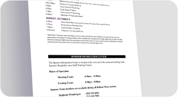 Albuquerque Interna tional Balloon Fies ta ® S ponsor Handboo k - 6 SATURDAY, OCTOBER 8 | ExxonMobil D ay 6:00am Dawn Patrol Show presented by Route 66 Ca sino Hotel and RV Resort 6:30am Krispy Kreme Morning Glow 7:00am Mass Ascension, p owered by ExxonMobil 8:00 - no on Chainsaw Carving Exhibition 11:00am Chainsaw Carving Auction 11:00am Balloon Fiesta Pin Trading (Group Tour Tent, north end of Main Street) 3:00 - 6:00 p m Chainsaw Carving Exhibition 5:00pm Team Fast rax ™ Skydiving 6:00 pm Night Mag ic™ Glow 7:30pm T eam Fastrax ™ Skydiving 8:00pm* AfterGlow™ Fireworks Show* SUNDAY, OCTOBER 9 6:00am Dawn Patrol S how presented by Route 66 Casino Hotel and RV Res ort 6:30am K ri spy Kre me Morning Gl ow 7:00am Farewell Mass Ascension 8:00 - noon Chainsaw Carving Exhibition *After Glow ™ fireworks shows will begin as soon as the launch field is clear of balloons, thus the starting times are approximate and sub ject to cha nge witho ut n o t ice. Ad ditionally, local police will m odify traffic flows to utilize all traffic lanes for outbound traffic only at the conclusion of each Glow event. So, if you want to watch the AfterGlow ™ fireworks shows from the Park, plan to arrive at t he Park in t i m e for tha t evening’s glow event. SPONSOR INFORMATION CENTER The Sponsor Information Cen ter is located at the west end of the restaurant building in t he Sponsor Hospitality area (Golf Training Center). Hours of Operat ion Morning Events 4 :30 am – 11:0 0 am Even ing Events 4:30pm – 8:00pm Sponsor Team members are available during all Balloon Fiesta sessions. Stephanie Prendergast (505) 553 - 443 4 Celi a Capron (214) 641 - 7683 Tracey H awkins (505) 350 - 3365
