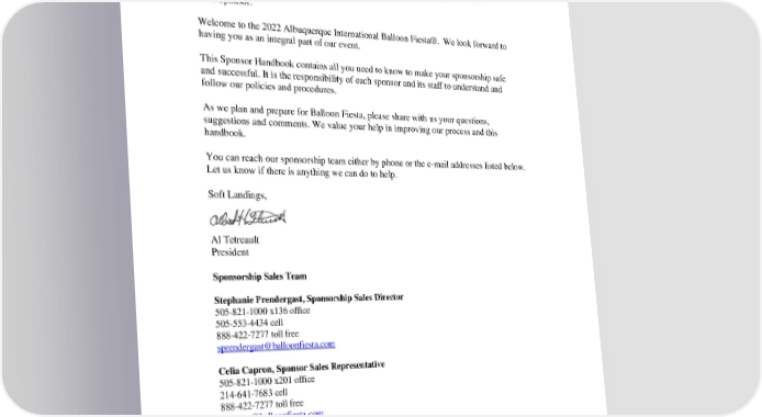 Albuquerque Interna tional Balloon Fies ta ® S ponsor Handboo k - 2 Dear Sponsor: Welcome to the 202 2 Albuquerque International Balloon Fiest a® . We look forward to having you as an integral part of our event. This Sponsor Handbook c o ntains all you nee d to know to make your sponsorship safe and successful. It is the responsibility of each sponsor and its staff to understand and follow our policies and procedures. As we plan and prepare for Balloon Fiesta, please share with us your qu e stions, sugges t ion s and comments. We value your help in improving our process and this handbook. You can reach our sponsorship team either by phone or the e - mail addresses listed below. Let us know if there is anything we can do to help. S oft Landin g s , Al Tetreault Pre sident Sponsorship Sales Team Stephanie Prendergast , Sponsorship Sales Director 505 - 821 - 1000 x 136 office 505 - 553 - 4434 cell 888 - 422 - 7277 toll free sprendergast @ bal loonfie sta.com Celia Capron , Sponsor Sales Representative 505 - 821 - 1000 x 201 office 214 - 641 - 7683 cell 888 - 422 - 7277 toll free ccapron @balloonfiesta.com Tra cey Ha wkin s , Sponsorship Sales Assistant 5 05 - 82 1 - 1 000 x 137 office 505 - 350 - 3365 cell 888 - 422 - 7277 toll free [email protected]