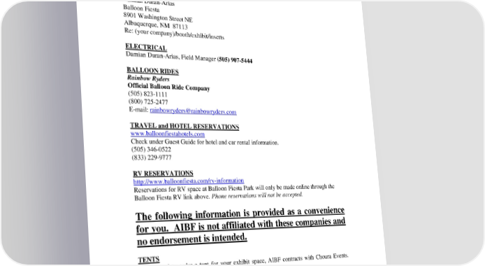 Albuquerque Interna tional Balloon Fies ta ® S ponsor Handboo k - 7 SERVICE PROVIDERS SHIP PING For se c urity, you must noti f y us in adva nce when to expect your shi pment, and its contents. Address all shipments to: Damian Du ran - Arias Balloon Fiesta 8901 Washington Street NE Albuquerque, NM 87113 Re: (your company) /booth/exhibit/inserts ELECT RICAL Da mian Duran - Arias , Field M an ager (505) 907 - 5444 BALLOON RIDES Ra inbow Ryders Official Balloon Ride Company (505) 823 - 1111 (800 ) 725 - 2477 E - mail: [email protected] TRAVEL and HOTE L RESERV ATIO N S www.ba l loonfiesta hotels .com Check under Guest Guide for hotel and ca r rental information. ( 505) 346 - 0522 (833) 229 - 9777 RV RESERVATIONS h ttp:/ / www.balloonfiesta.c om / rv - information Reservations for RV space at Balloon Fiesta Park will only be made online through the Balloon Fi esta RV link above . Phone reservations will not be accepted. The following information is provided as a conv enience for y ou. AIBF is not af fi liated with these companies and no en do rsement is intended. TENTS If you need to order a tent for your exhibit space, AIBF contracts with Choura Events . They can be reached at 310 - 320 - 6200. PROPANE If you need propane, tanks will b e provided by the A IB F - selected supplier. The propane supp li er will bill you directly for propane use. AIBF will supply propane for Corporate Village patio heaters. To order, contact a Sponsorship Team representative.