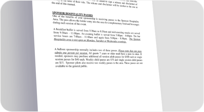 Albuquerque Interna tional Balloon Fies ta ® S ponsor Handboo k - 21 BALLOON RIDES Your Ballo on Sponsorship benef its include two bal loon r ides (1 person = 1 ride). If you n eed additional rides, our off icial balloon ride company is Rainbow Ryders, (505) 823 - 1111 or ( 800) 725 - 2477. You may also email rainbowryders@r ainbowryders.com o r visi t www.rainbowryders .com . Balloon Fiesta guests who will receive a ball oon ride fro m the Official B alloon Ride Concessionaire will be asked to sign a release and discl aimer of liability a t the time of their ride. The release and disclaimer will b e similar to the one at the e nd of this manual. SPONSOR HOSPITALITY PASS ES One of the benef i ts of your spon sorship is receiving passes to the Sponsor Hospitality Area. The pas s allows the holder entry into the area for c omplimentary food and beverages dur ing each session of the event . A breakfast buffet is served from 5:30 am to 8:3 0am and mid - m orning snacks a re served from 9: 3 0am - 11: 00 pm. An evening buf fet is served from 5: 00pm - 8:00 pm. The b ar service hours ar e 7: 00 am - 11:00 am and again from 5:00 pm - 8: 3 0 pm . The Sponsor Hospitality area is not open on Monday, Tuesday or Wednes day evenings . A balloon sp onsorshi p normally includes two of these passes. Please note that one pass admits one pe rson per session. All gue sts 7 years or older must have a pass to enter. If needed, sponsors may purch ase additional all session adul t passe s for $3 00 e a ch or single se ssion passes for $4 0 each. Weekly child passes are $75 and sin gle session child passes a re $15 . Sponsor pilots a lso rec eive two weekly passes to the a rea. These passes are not available to the general public.