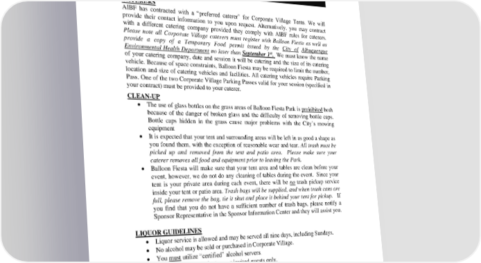Albuquerque Interna tional Balloon Fies ta ® S ponsor Handboo k - 18 Trans it Bus Pass passengers mus t have an admission ticket to enter Bal loon Fiesta Par k. Guest w r istbands and/or buttons ar e not valid for a dmission to Ball oon Fiesta Park. CATERING & RELATED CATERERS AIBF has c ontracted with a “preferr ed caterer” for Corporate Village Tents. We will provide their contact information to you upon req uest. Alte rn a tively, you may contract with a different catering company provided they comply with AIBF rules for caterers. Please no te all Corporate Village caterers must register with Balloon Fiesta a s well as provide a copy of a Temporary Food permit is sued by th e C ity of Albuquerque Environmental He alth Department no later tha n September 1 st . We must know the name of your catering company, date and session it will be catering and the size of its cat ering vehicle. Because of space constra ints, Balloon F iesta may be required to limit the number, lo cation and siz e of catering vehicles and f acilities. All catering vehicles requir e Parki ng Pass. One of the two C orporate Village Parking Passes valid for yo ur session (specified in your contract) must be provid ed to your c a terer. CLEAN - UP • T he use of g lass bottles on the grass a reas of Balloon Fiesta Park is pr ohibited both because of the danger of broken glass a nd the difficulty of removing bottle caps. B ottle caps hidden in the grass cause ma jor problems with the Cit y’s m o wing equipment • It is expected that your tent and surroun ding areas will be left in as good a shape as you found them, with the exception of re asonable wear and tear. All trash must be pi cked up and remove d from the tent and p atio area. Please make s ure y o ur caterer removes all food a nd equipment prior to leavi ng the Park. • Balloon Fiesta will make sure that your tent ar ea and tables are clean b efore your event, however, we do not do any cleaning of tables during the event. S ince your tent is your pr ivate area during each event, there will be no trash pickup se rvice inside your tent or patio area. Trash bags will be supp lied, and when trash cans are full, please remove the bag, tie it shu t and place it beh ind your tent for pic kup. If you find that y ou do not have a sufficient number of trash bags, please notif y a Sponsor Representative in the Sponsor Information Center and they will assist you. LIQUOR GUIDELINES • Liquor service is allowe d and may be served all nine days, incl u ding Sundays. • No alcohol may b e sold or purchased in Corpor ate Village. • You must utili ze “certified” alcohol servers. • Liquor service must be to you r invited guests only. • Mi nors may not serve, possess or consume alcoh ol. • Intoxicated persons may not possess or consume alcoho l. • No a lcoh o l may be removed from your ten t and patio area. • You must obtain the alcohol prior to Balloon Fiesta and have it served by your caterers or serv ers. • You must name AIBF as an additional i nsured and provide a certificate of $1, 0 00,000 “host liab ility” insu r a nce prior to the start of Bal loon Fiesta no