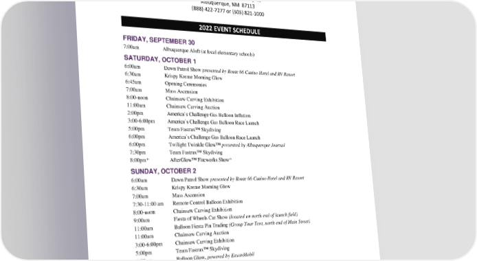 Albuquerque Interna tional Balloon Fies ta ® S ponsor Handboo k - 4 BALLOON FIESTA PARK ADDRESS / PHONE Albuquerque International Balloon Fiesta Balloon Fiesta Park 5000 Balloon Fiesta Parkway NE Albuquerque, NM 87113 (888) 422 - 7277 or ( 5 05) 821 - 1000 202 2 EVENT SCHEDULE FR IDAY, SE PTEMBER 30 7:00a m Albuquerque Aloft (at local elementary schools) SATURDAY, OCTOBER 1 6:00am Dawn Patrol Show presented by Route 66 Casino Hotel and RV Resort 6:30am Krispy Kreme Morni ng Glow 6:45am Opening C e remonies 7:00am Mass Ascension 8:00 - noon C hainsaw Carving Exhibition 11:00 am Chainsaw Car ving Auction 2:00pm America’s Challenge Gas Balloon Inflation 3:00 - 6:00pm America’s Challenge Gas Balloon Race Launch 5:00 pm Team Fastrax ™ Skydi ving 6:00 pm America ’ s Challenge Gas Balloon Rac e Launch 6:00pm Twilight Twin k le Glow™ presented by Albuquerque Journal 7:30pm Team Fastra x ™ Skydiving 8:00pm* Aft erGlow™ Fireworks Show * S UNDAY, OCTOBER 2 6 :00am Dawn Patrol Show presented by Route 66 Casino Hotel and RV Resort 6:30am Krispy Kreme Morning Glow 7:00am Mass Ascen s i on 7:30 - 11: 00 am Remote Control Balloon Exhibition 8:00 - noon Chainsaw C arving Exhibition 9:00am Fiesta of Wheels Car Sho w (located on north end o f launch field) 11: 00am Balloon Fiesta Pin Trading (Group Tour Tent, north end o f Main Street) 11:00am Cha i n saw Carving Auction 3:00 - 6:00pm Chainsaw Carving Exhibition 5:00pm Team Fa strax ™ Skydiving 6:00pm Balloon Glow, p owered by Exxon Mo bil 7:30pm Team Fastrax ™ Skyd iving 8:00pm* AfterGlow™ Fireworks Show*